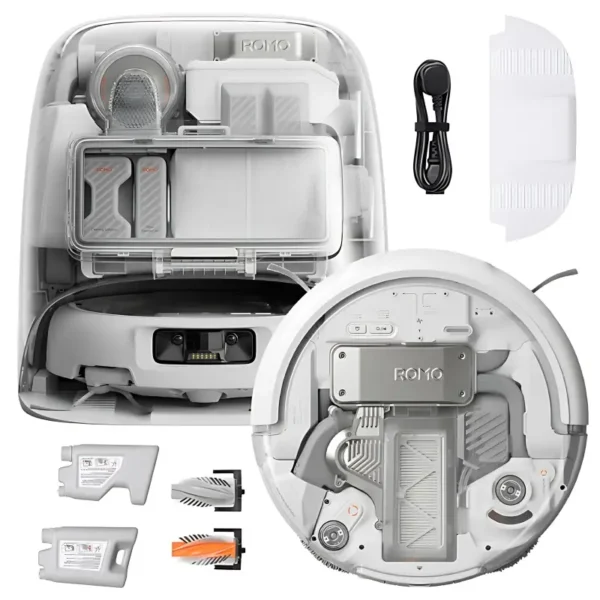 ROMO A kommer med en elegant hvid dockingstation, som stadig tilbyder selvrensning med varmtvandsvask og varmluftstørring af moppen. Den mangler dog UV-sterilisering og lugtneutralisering, som findes i P-modellen. For virksomheder, hvor disse ekstra hygiejnefunktioner ikke er en topprioritet, tilbyder ROMO A næsten den samme kerneydelse og kraft til en potentielt mere tilgængelig pris.
