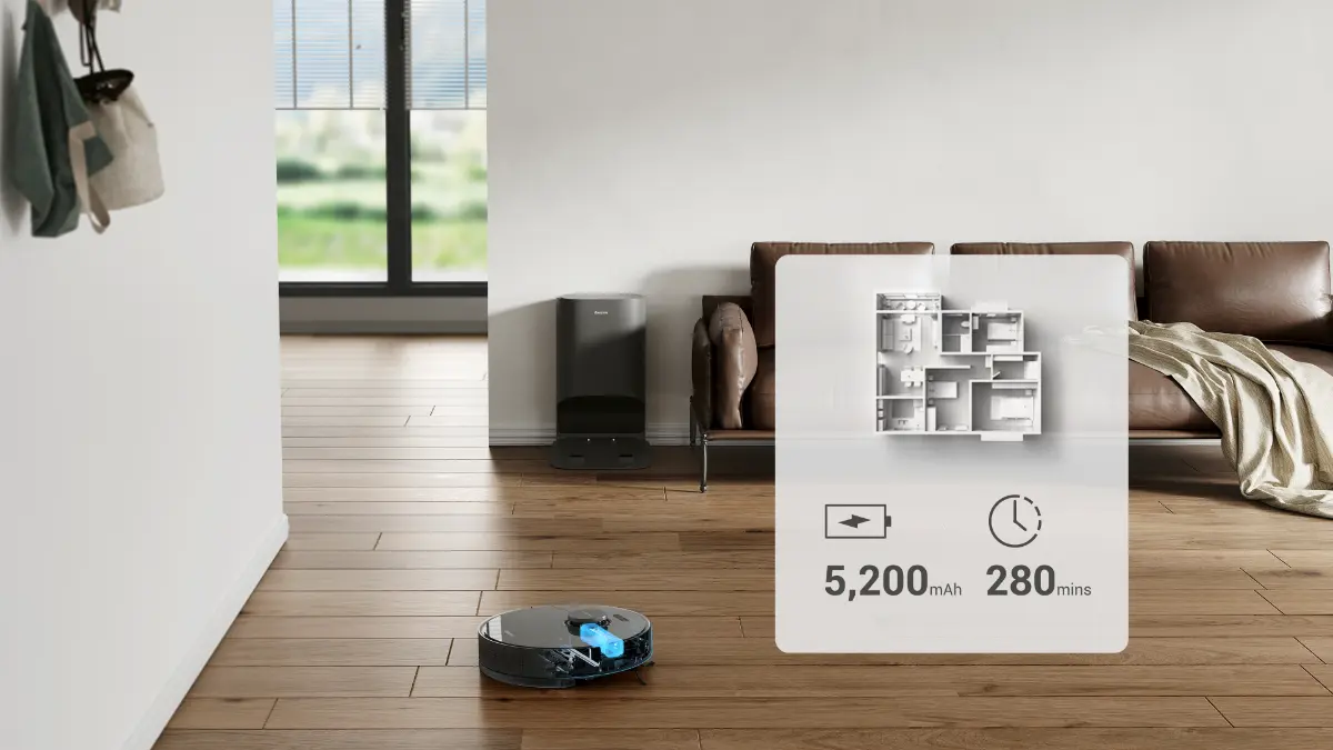 Dreame Robotstøvsuger Bot D10s Plus har op til 280 minutters batteritid pr. opladning, med 5200 mAh for fuld rengøring.