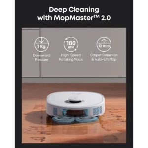 Den er fremragende på begge med 8.000 Pa sugekraft til tæpper og trykstyret moppe til hårde gulve. Automatisk løft beskytter tæpper mod vand, mens AI sikrer fuld dækning.