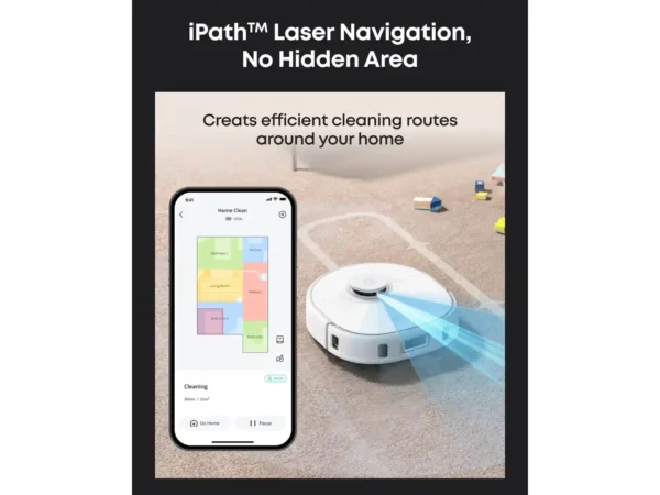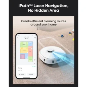 Eufy X10 Pro Omni starter via appen, hvor du sætter zoner og tider. Den kortlægger hjemmet med LiDAR og rengør systematisk. Moppen løftes automatisk over tæpper, og stationen håndterer resten. Efter test i et 80 m² hjem tog en fuld runde kun 45 minutter, med minimalt snavs tilbage. Den er perfekt til ugentlig vedligeholdelse eller daglig hurtigrengøring.