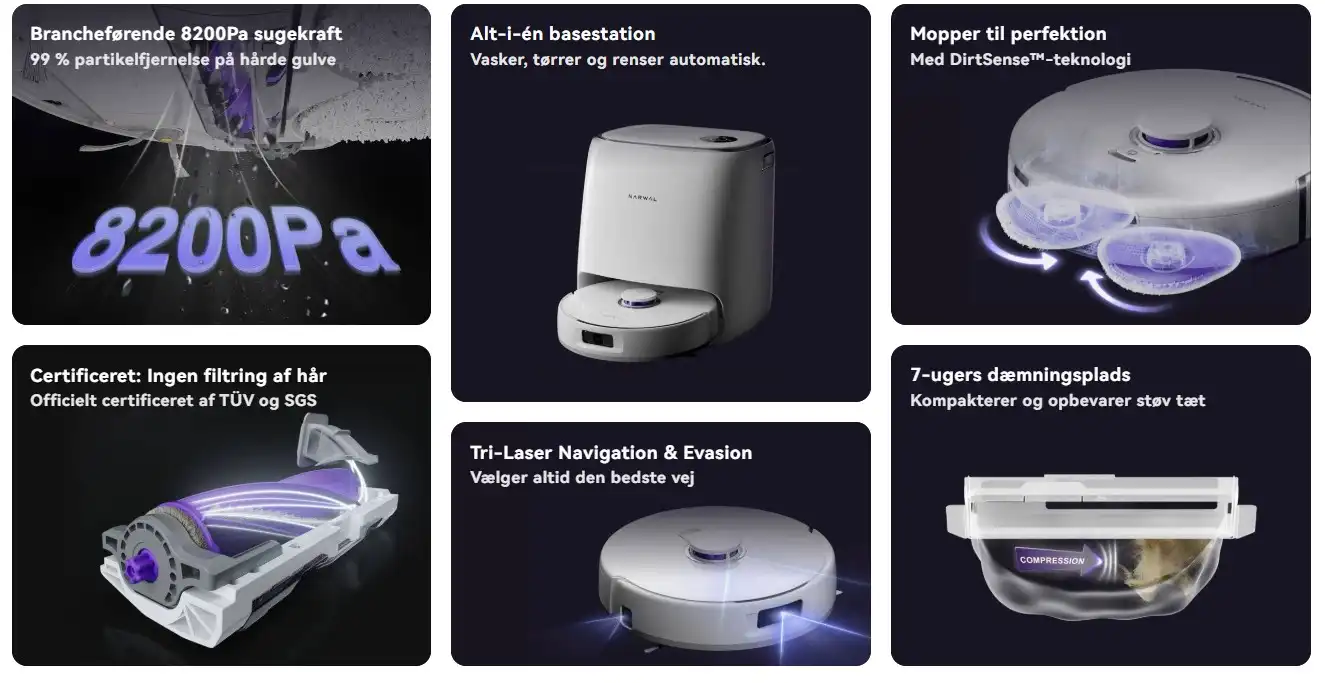Sammenlignet med entry-level modeller adskiller den sig med Zero Tangle Brush, der fjerner 99,5 procent af hår uden vedligeholdelse, certificeret af SGS og TÜV. Vores tests bekræfter, at appen giver real-time overvågning og kortlægning, hvilket øger brugen. Den er perfekt som primær rengøringsløsning. For at udforske flere varianter, tjek Narwal robotstøvsuger og find den rette til dit hjem.