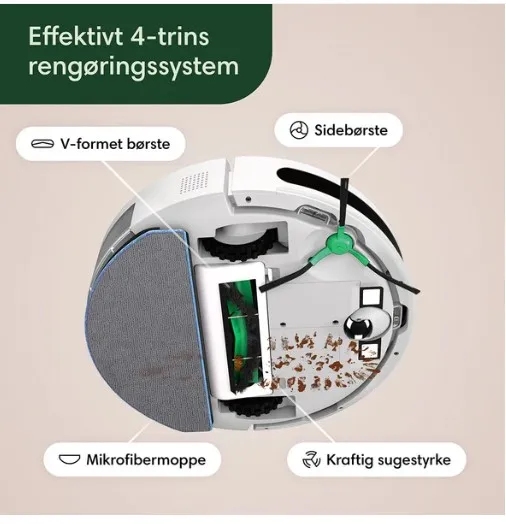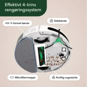Vores test af Roomba Combo Essential Hvid viser, at denne robot leverer imponerende resultater. Dens 4-trins rengøringssystem fjerner støv, snavs og pletter med en V-formet gummibørste, en sidebørste og en mikrofibermoppe. Den er ideel til både tæpper og hårde gulve, og dens smarte navigation sikrer grundig rengøring.