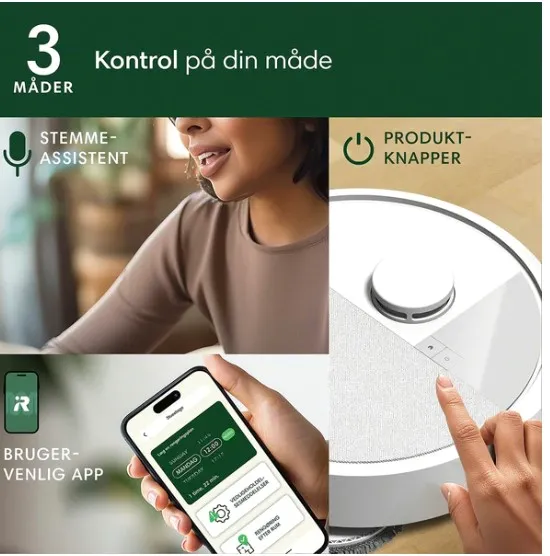 Robotten kan styres via app, stemmeassistent eller knapper på enheden, hvilket gør den utrolig fleksibel. Efter test konstaterede vi, at dens evne til at rengøre højtrafikområder gentagne gange er en stor fordel. For eksempel håndterer den nemt krummer under spisebordet eller mudder i entréen. Udforsk produktet nu og oplev en ny standard for rengøring!