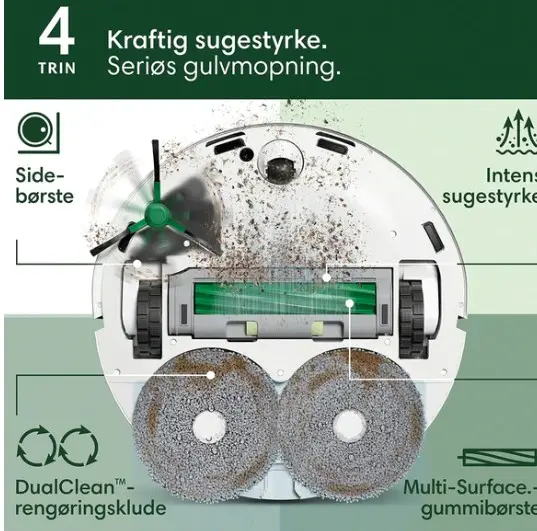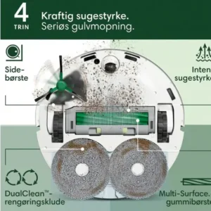 Baseret på vores analyser er denne robotstøvsuger et topvalg på grund af dens unikke funktioner. Den tilbyder en kombination af støvsugning og gulvmopning, hvilket gør den alsidig til ethvert hjem. Dens DualClean™-rengøringsklude og SmartScrub-teknologi sikrer dobbelt så effektiv skrubning sammenlignet med standardmodeller. Desuden gør den brugervenlige Roomba Home-app det nemt at styre rengøringen præcist efter behov.