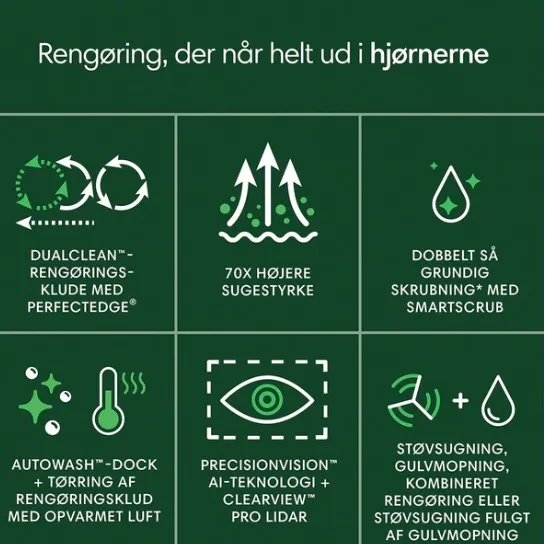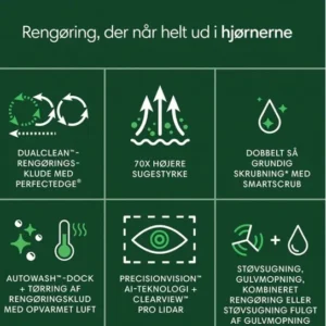 Med PrecisionVision AI og AutoWash-dock er den designet til bekvemmelighed. Den er perfekt for danske familier, der ønsker effektivitet og hygiejne.