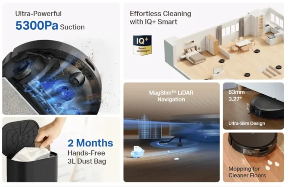 Den bruger MagSlim LiDAR og gyroskop for præcis kortlægning og undgåelse af forhindringer, hvilket minimerer gentagelser.